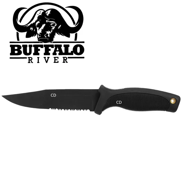 COUTEAU DAGGER NOIR BUFFALO RIVER :Caractéristiques :-Superbe couteau de chasse, de marque Buffalo River.-Lame dentelée en Titanium, de 15cm.-Manche en Nylon.-Livré avec un étui de ceinture Cordura.