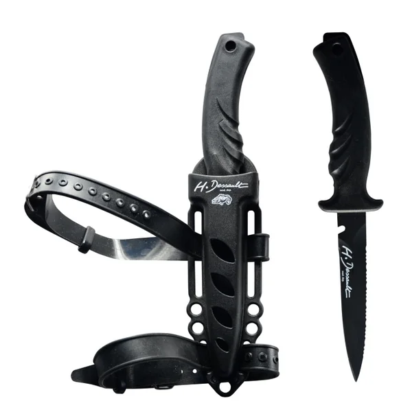Dague de chasse sous marine, Lame inox aspect noir mat de 11,5 cm. Etuis fournis, avec sangles et passant de ceinture.