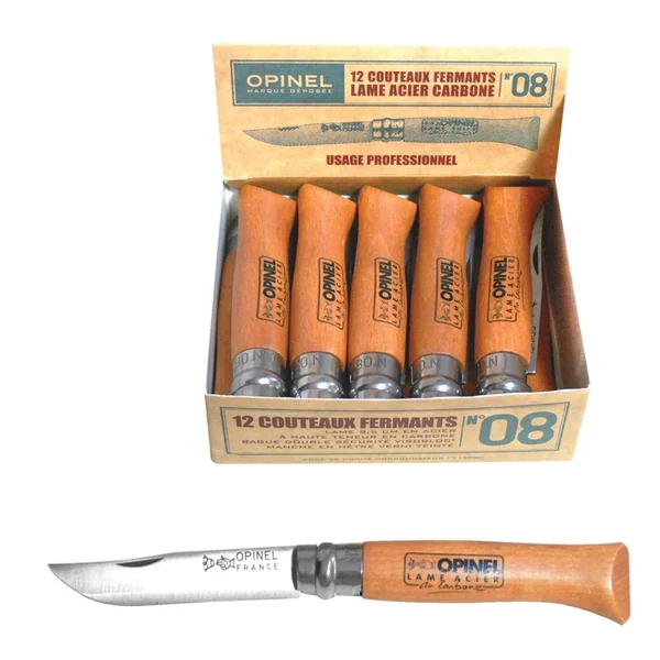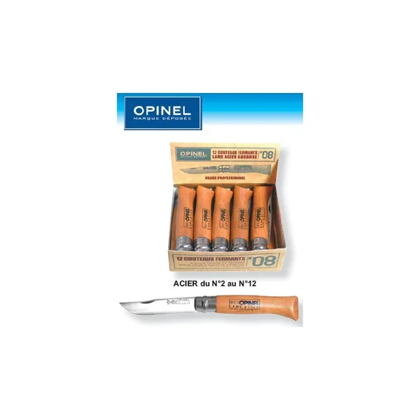 | Couteau Opinel Virobloc | N°2 3.5 cm ouvert N°3 4 cm ouvert N°4 5 cm ouvert N°5 6 cm ouvert N°6 7 cm ouvert N°7 8 cm ouvert + fermé N°8 8.5 cm ouvert + fermé N°9 9 cm ouvert + fermé N°10 10 cm ouvert + fermé N°12 12 cm ouvert + fermé N°13 22 cm ouvert + fermé Livré par 12 pour la réf OP6 à OP9 Livré par 6 pour la réf OP10 et OP12 |