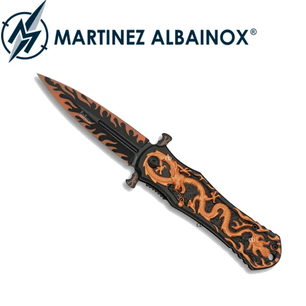 Normal 0 21 false false false FR X-NONE X-NONE /* Style Definitions */ table.MsoNormalTable {mso-style-name: »Tableau Normal »; mso-tstyle-rowband-size:0; mso-tstyle-colband-size:0; mso-style-noshow:yes; mso-style-priority:99; mso-style-parent: » »; mso-padding-alt:0cm 5.4pt 0cm 5.4pt; mso-para-margin-top:0cm; mso-para-margin-right:0cm; mso-para-margin-bottom:10.0pt; mso-para-margin-left:0cm; line-height:115%; mso-pagination:widow-orphan; font-size:11.0pt; font-family: »Calibri », »sans-serif »; mso-ascii-font-family:Calibri; mso-ascii-theme-font:minor-latin; mso-hansi-font-family:Calibri; mso-hansi-theme-font:minor-latin; mso-fareast-language:EN-US;} COUTEAU PLIANT A OUVERTURE ASSISTEE MARTINEZ ALBAINOX DRAGON : Caractéristiques :-Couteau design, Dragon et Flamme Orange.-Lame de 8,8cm à ouverture assistée rapide.-Verrouillage type linerlock.-Manche aluminium.-Longueur de la lame : 8,8cm.-Longueur totale :20,7cm.*Arme soumise à la législation. Carte didentité OBLIGATOIRE.