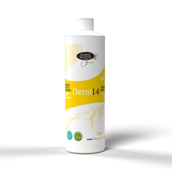 Le gel Derm 14 de Horse Master est un soin ciblé contre la dermite estivale : sa formule végétale enrichie en benzoate de benzyle permet un soulagement immédiat des démangeaisons, une protection renforcée des zones irritées, et une texture non grasse bien adaptée à un usage fréquent. Il convient particulièrement en période chaude et insectifuge, notamment pour chevaux sensibles. Gel non gras : pénètre facilement, ne laisse aucun résidu huileux sur la crinière, la queue ou la peau Soulage instantanément les irritations cutanées liées aux piqûres d’insectes (culicoïdes, moustiques, taons…) et la dermite estivale Protège la peau et les crins fragilisés par les grattages, en renforçant leur hydratation et élasticité Aide à prévenir les infections secondaires en couvrant les zones irritées . Favorise la repousse des poils sur les zones touchées Conseils d’utilisation : Premières applications : appliquer l’équivalent d’une noix de gel (taille d’une grosse noisette) dans la paume. Enduire la base de la queue et la crinière, puis massages énergiques à rebrousse-poils pour faire pénétrer jusqu’à la peau Fréquence initiale : 2 à 3 fois par jour pendant les premiers jours. Entretien : réduire la fréquence à une application par semaine, ou dès qu’un nouveau grattage est observé