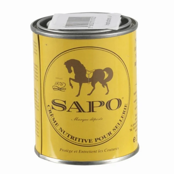 La crème nutritive SAPO est un soin traditionnel pour cuir lisse, spécialement conçue pour nourrir, assouplir et régénérer les cuirs de sellerie et autres articles en cuir. Elle s’utilise principalement après un nettoyage pour restaurer souplesse, protection et endurance du cuir. Nourrit en profondeur le cuir pour éviter qu’il ne sèche ou devienne rigide. Assouplit les cuirs durs, anciens ou desséchés, leur rendant plus confortables à l’usage Régénère et revitalise les fibres du cuir fatigué. Protège contre l’humidité, ce qui limite la formation de moisissures et taches. Renforce la résistance du cuir face à l’usure et protège les coutures.