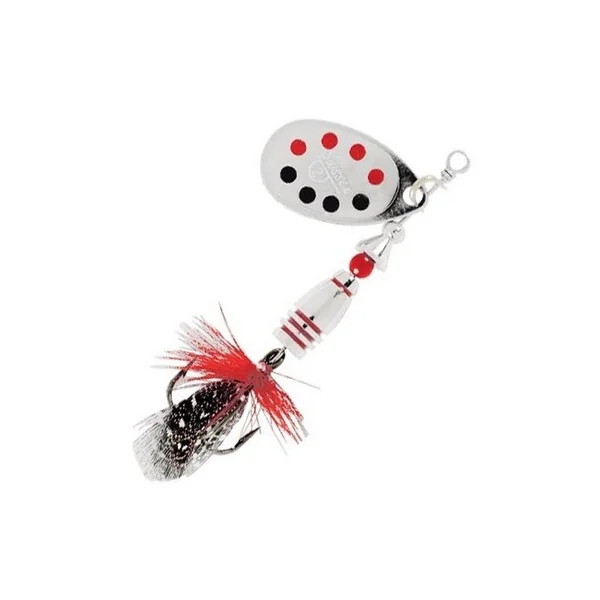 Cuiller Tournante Suissex Argent PRNM Cuiller Ultra Argent PRNM SUISSEX. Décor «argent» avec points rouges et noirs sur la palette et liseré rouge sur le lestage.