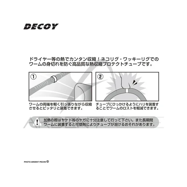 Les Worm Holder WH-01A sont des tubes transparents thermo-retractables conçus pour augmenter la durée de vie des worms montés en wacky rig. Le sachet contient 5 tubes de diamètres différents (4 mm – 6 mm – 8 mm – 10 mm – 12 mm) qui vous permettront de vous adapter à l’épaisseur des différents worms que vous utilisez. Choisissez un tube un petit peu plus épais que votre leurre, découpez une section de 5 mm de tube, placez cette baque autour du leurre puis chauffez-la à l’aide d’un briquet, elle va se rétracter et venir faire corps avec le leurre. Il ne vous reste plus qu’à piquer votre hameçon directement dans cette bague pour disposer d’un montage qui aura profité de l’opération pour gagner énormément en durée de vie.