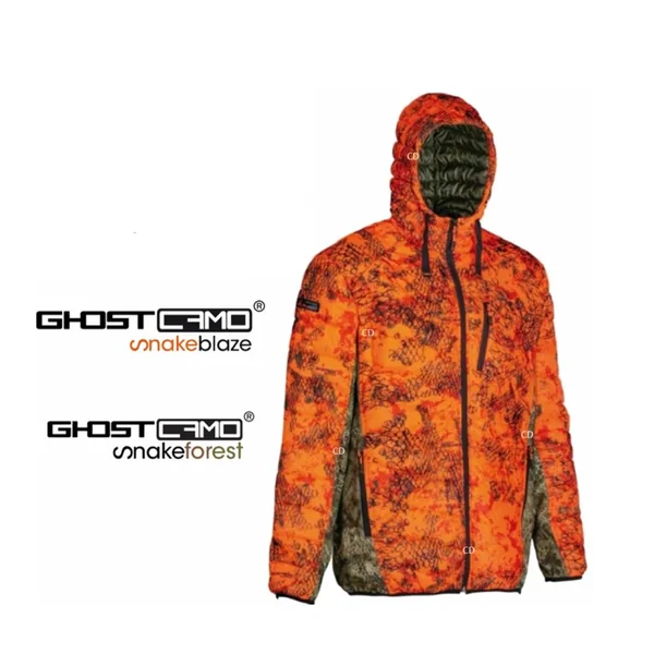 Doudoune à capuche, couleur camo Snake Blaze, 100% polyester, de marque Ligne Verney Carron.