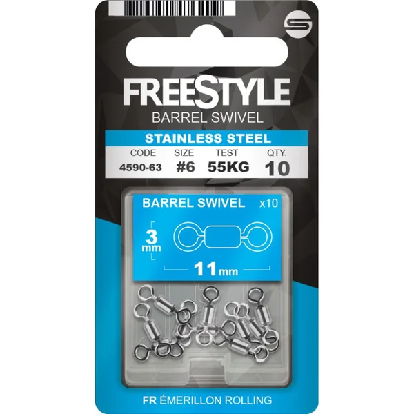 Fabriqués à partir d’acier inoxydable, vous pourrez utiliser ces émerillons barils en eau salée ou saumâtre. Conditionnés par 10, les émerillons barils FreeStyle Stainless Swivel pourront être utilisés sur une grande partie de vos montages. Ainsi, ils éviteront à votre tresse de vriller à l’utilisation d’une cuiller tournante ou ondulante ou autres leurres.