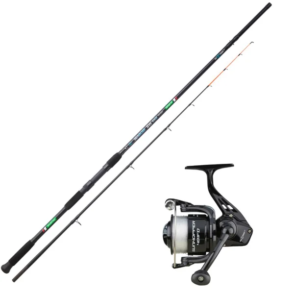 L’ensemble Sunset Seaboss 2,10m est conçu pour la pêche en mer à soutenir, la canne Seaboss est sensible, avec de la réserve de puissance, un scion fluo favorisant la détection des touches, et équipée d’un moulinet Sunset Sunhopper 401Fd garni de fil.