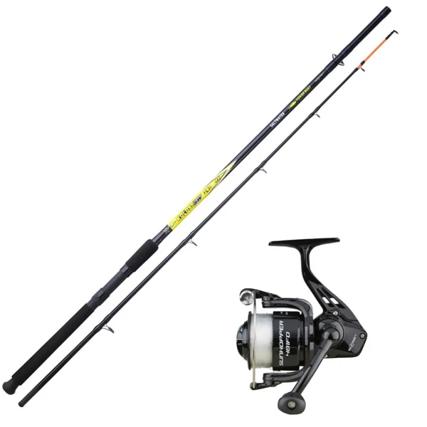 La canne Sunset Koloss est une canne spinning polyvalente, en composite, avec une poignée EVA noire et un scion fluorescent orange. Associée au moulinet frein avant Sunset Sunhopper 401FD garni de fil, elle forme un ensemble prêt à pêcher en digue, en bateau ou du bord.