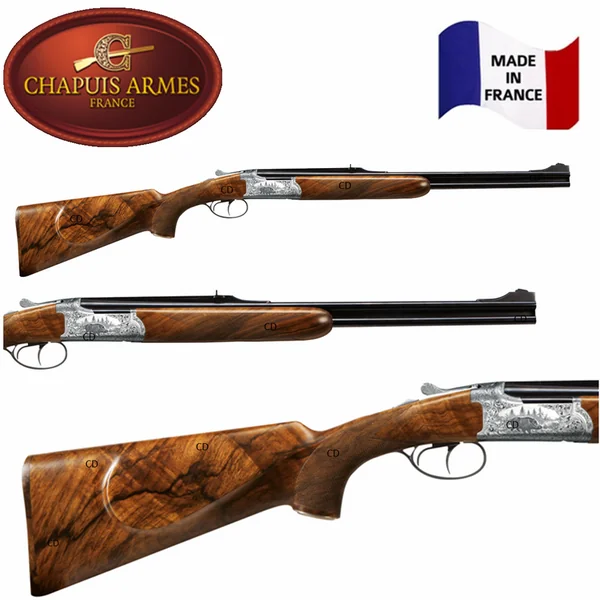 Construit autour d’une bascule tout acier, basse et étroite, aux arrondis subtils ornés d’une gravure délicate en « tapisserie », ces carabines superposées poids plume, de marque Chapuis, possèdent un équilibre surprenant.