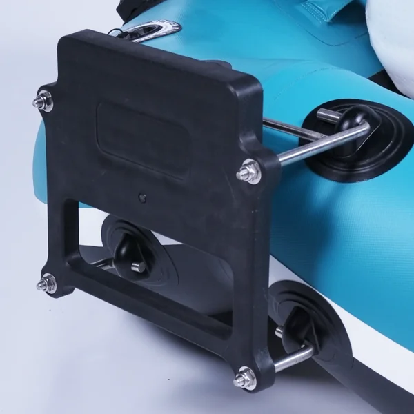 il est d’origine équipé d’un support moteur arrière central pour les moteurs électrique classique, mais également d’un « Finbox » central, patch support à glissière installé en dessous, sur le fond dropstitch afin d’accueillir les moteurs électriques immergés de dernière génération (comme les moteurs KAHE SURF)