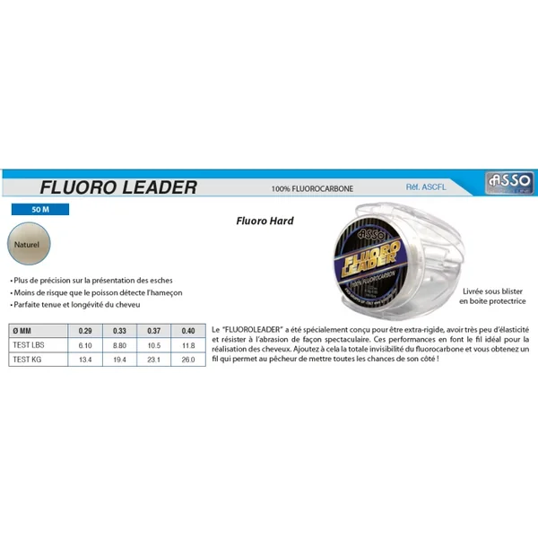 Fluorocarbone Asso Fluoro Leader 50 m Le “Fluoro leader” Asso a été spécialement conçu pour être extra-rigide, avoir très peu d’élasticité et résister à l’abrasion de façon spectaculaire. Ces performances en font le fil idéal pour la réalisation des cheveux. Ajoutez à cela la totale invisibilité du fluorocarbone et vous obtenez un fil qui permet au pêcheur de mettre toutes les chances de son côté :