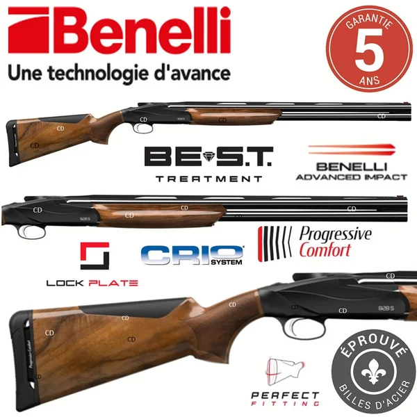 -Il dispose de la seconde génération du système de recul PROGRESSIVE CONFORT qui a été breveté : réduction du recul de plus de 50%, réduction du fouet du canon, action progressive, plaque de couche et busc doux et ergonomiques (interchangeables), poignet pistolet à préhension optimisée,…
