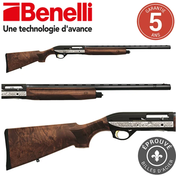 La gravure élégante du fusil Benelli Montefeltro DUCA qui décore la carcasse représente des scènes naturelles et le profil d’un chien de chasse.