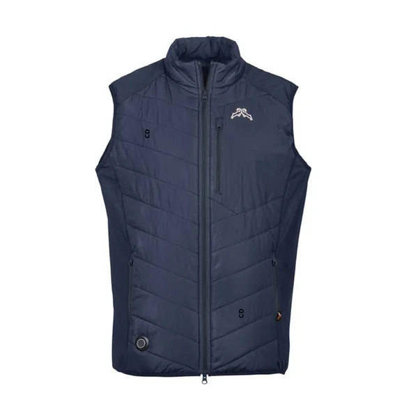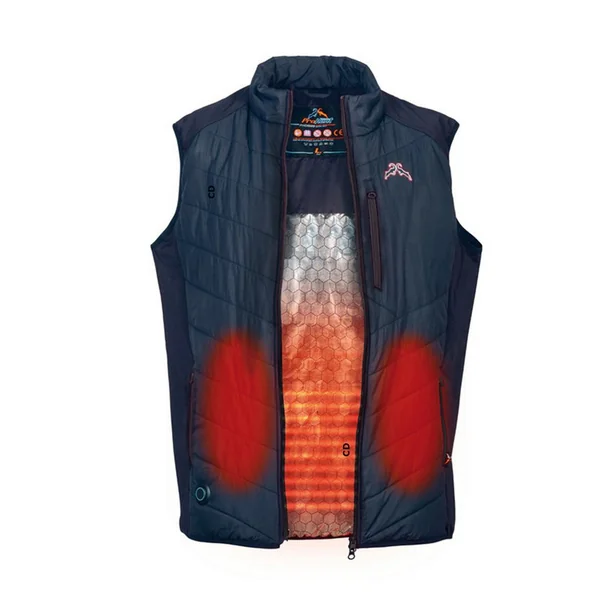 Gilet chauffant hybride, de marque Pro Hunt, parties avant et arrière 100% polyester, coté en tricot 80% polyester 20% élasthanne apportant plus de confort et d’aisance dans les mouvements.
