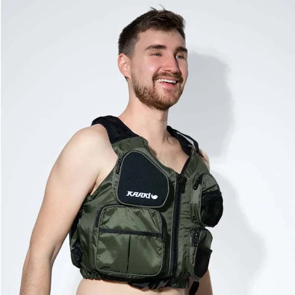 Gilet kayak pêche Aqua Design Kaaki 50N Vert Le gilet KAAKI est idéal pour la pêche ou la randonnée en canoë kayak. Équipé de très nombreuses poches, il permet d’embarquer tout le matériel qu’il vous faut lors de vos sorties nautiques. Très confortable grâce à ses épaules en Néoprène, vous ne pourrez plus vous en passer lors de vos expéditions en pleine nature.