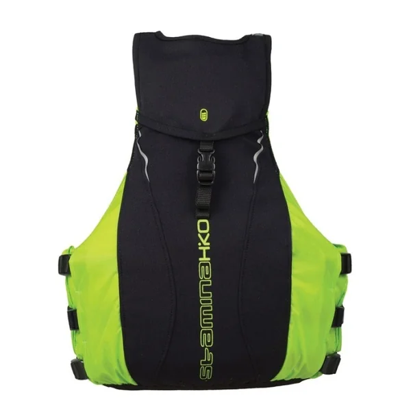 Gilet kayak Hiko Stamina – 50N | XS L’un des principaux avantages est le profil extrêmement bas du panneau avant qui permet au pagayeur de disposer d’une gamme complète de mouvements sans contrainte. Les bretelles sont en néoprène souple. Cachés à l’intérieur des panneaux d’épaule, deux sangles haute tension garantissent que le gilet respecte toutes les normes de sécurité. Stamina est équipé d’une paire de trois sangles réglables; les lanières s’assurent que le gilet s’adapte bien au corps et ne glisse pas lorsque vous pagayez. Il y a une grande poche frontale à l’avant ainsi que deux petites poches pour réchauffer vos mains froides. La grande poche arrière peut contenir une vessie et des crochets placés à des endroits stratégiques maintiennent le tube à boire en place. Il y a des éléments réfléchissant sur le dos et les épaules. Caractéristiques Gilet kayak Hiko Stamina – 50N | XS
