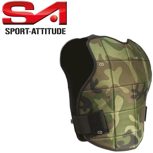 GILET SOUPLE REVERSIBLE NOIR/CAMO SPORT ATTITUDE :Caractéristiques :-Gilet souple, réversible, de marque Sport Attitude.-Gilet souple réversible Camo/Noir.-Matelassage protège la poitrine et le dos.-Réversible, une face noire et une camo.*Taille unique.
