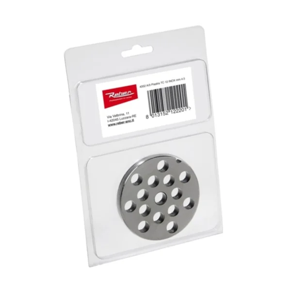 La grille de hachoir de Reber est conçue pour les hachoirs n°22 de Reber. Cette grille en acier inoxydable est ici présentée en diamètre 4,5 mm vous permettant de réaliser vos farces pour vos patés fins. Pour la longévité de ce produit, nous vous conseillons de ne pas la laver en lave-vaisselle. Il sera préférable d’effectuer un nettoyage à l’eau chaude avec un liquide vaisselle de façon manuelle. Cette grille en acier inoxydable n’est pas prévue pour un usage intensif. Elle conviendra donc parfaitement bien aux débutants ainsi qu’aux personnes qui hachent de manière occasionnelle. Veillez à bien utiliser un couteau en acier lorsque vous disposez d’une grille en acier. Si votre grille est en acier inoxydable, il faudra acheter un couteau en acier inoxydable.