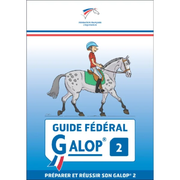 Livre « Guide fédéral Galop 2 ». Connaissances générales présente les différentes activités équestres et les hébergements des poneys et des chevaux avec un gros plan sur les priorités de circulation à cheval et les figures de manège. Connaissance du cheval approfondit l’anatomie et la physiologie du cheval, ses 5 sens, sa tête, ses membres, les caractéristiques des robes. Il aborde l’organisation sociale des chevaux entre eux et fait un gros plan sur leur comportement alimentaire. S’y ajoute la présentation des principaux types de poneys et de chevaux. S’occuper du cheval fait une large place aux différentes manipulations du cheval pour aller le chercher et le ramener dans son lieu de vie. Il explique comment effectuer le pansage, mettre le filet, entretenir la selle et distribuer les aliments. Pratique équestre à pied explique comment mener le cheval en main, lui faire déplacer sa tête, ses épaules ou ses hanches et le faire reculer. Pratique équestre à cheval explique comment devenir autonome pour bien maîtriser le montoir, le réglage du matériel et la tenue des rênes. Il détaille la bonne posture au trot et au galop ainsi que les transitions qui permettent de bien maîtriser toutes les allures et d’aborder le saut. Le Guide se conclut avec les outils qui vous permettent de passer le Galop®2 et de s’orienter vers le Galop®3. Les encadrés Sécurité, Zoom, A retenir et les QCM facilitent la mémorisation, les encadrés En savoir plus, Lexique, la culture équestre.