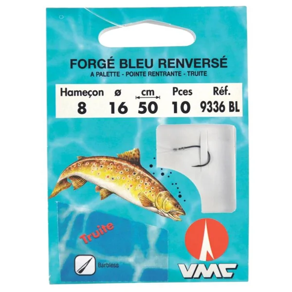 Hameçon monté spécial truite. Il s’agit d’un hameçon forgé bleu renversé sans ardillon.