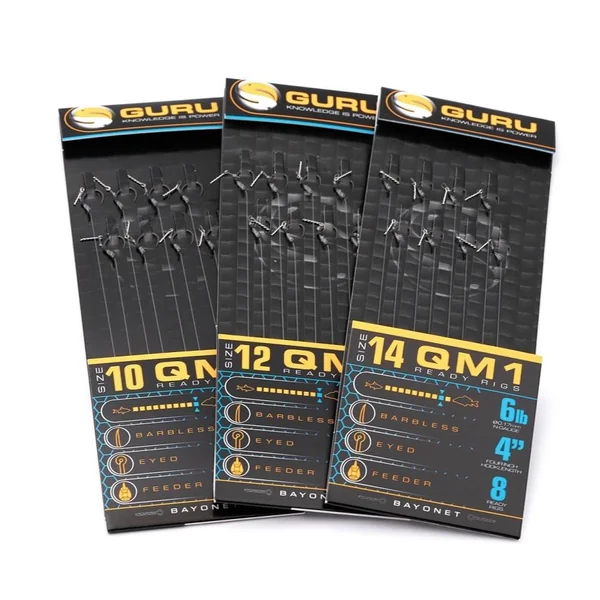 Les bas de ligne Guru QM1 10cm sont destinés à la pêche au feeder et au method feeder avec un cheveu. Grâce à leur hampe courte et courbée, les hameçons QM1 assurent des ferrages efficaces. Ils sont ici montés avec un cheveu et une baïonnette.