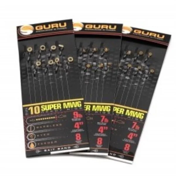 Les bas de ligne Guru Super MWG 10cm sont destinés à la pêche en carpodrome. L’hameçon Super MWG à oeillet est polyvalent, et ici monté avec un cheveu et un élastique.