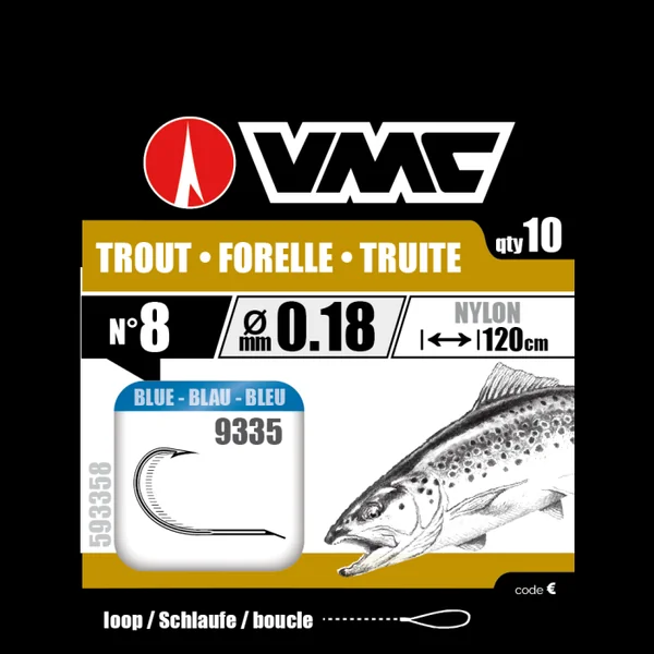 Hameçons montés Vmc 9335 BL Spécial Truite – n°6 sur 20/100 Pochette de 10 bas de ligne .