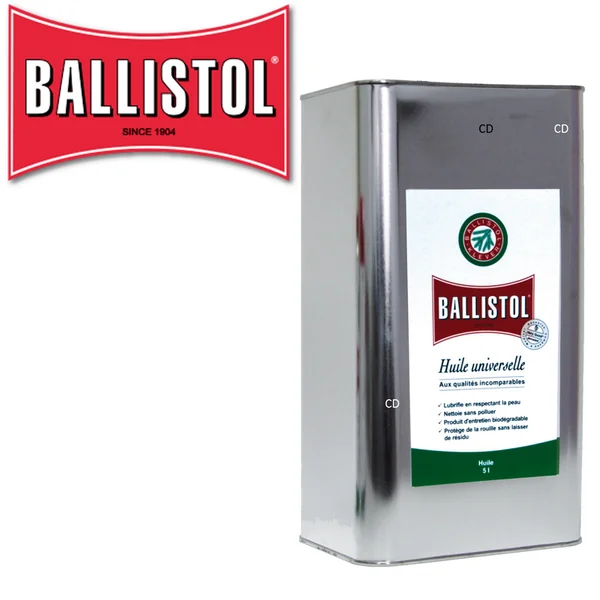 HUILE UNIVERSELLE BALLISTOL 5L :Caractéristiques :-Huile universelle -Infaillible et sans pareil ! -Pour l’entretien du métal, bois, cuir, gomme, plastique, poil, peau et encore plus d’usages pour l’artisanat, l’industrie, l’agriculture, le ménage, le jardin, le domaine de l’automobile, la pêche à la ligne, la chasse et le tir.-Ballistol protège de la rouille, lubrifie, nettoie, et agit sur les résidus de poudre, les dépôts de plomb, de cuivre et de tombac.-Il pénètre dans les plus petites fissures, dissout les résidus et résines provenant de l’usage d’huiles inadéquates.-Il neutralise les résidus acides de combustion.-Idéal pour le soin, la récupération et l’imprégnation des fûts en bois et des bretelles en cuir.-Lubrifie en respectant la peau.-Nettoie sans polluer.-Produit d’entretien biodégradable.-Protège de la rouille sans laisser de résidu.-Contenance : 5Litres.*DANGEREUX ! Respecter les précautions d’emploi. Normal 0 21 false false false FR X-NONE X-NONE /* Style Definitions */ table.MsoNormalTable {mso-style-name: »Tableau Normal »; mso-tstyle-rowband-size:0; mso-tstyle-colband-size:0; mso-style-noshow:yes; mso-style-priority:99; mso-style-parent: » »; mso-padding-alt:0cm 5.4pt 0cm 5.4pt; mso-para-margin-top:0cm; mso-para-margin-right:0cm; mso-para-margin-bottom:10.0pt; mso-para-margin-left:0cm; line-height:115%; mso-pagination:widow-orphan; font-size:11.0pt; font-family: »Calibri », »sans-serif »; mso-ascii-font-family:Calibri; mso-ascii-theme-font:minor-latin; mso-hansi-font-family:Calibri; mso-hansi-theme-font:minor-latin; mso-fareast-language:EN-US;}
