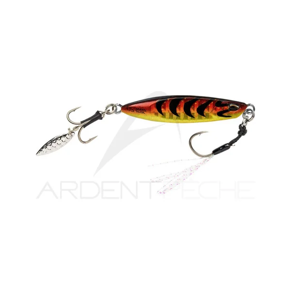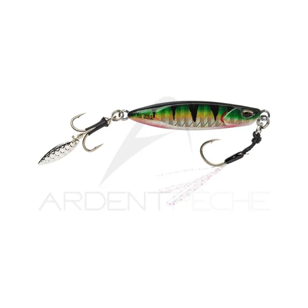 Le Drag Metal Cast Shot est un casting jig qui se distingue par ses flancs plats et son hameçon triple à palette en queue. Cette palette vient compléter des flashs lumineux importants, émis lors de la descente du leurre flanc sur flanc, en apportant une vibration supplémentaire. C’est un leurre polyvalent, qui peut être animé par une succession de coups de scion entrecoupés de pauses, en traction en le laissant redescendre bannière semi tendue pour le faire planer, mais aussi en simple récupération linéaire. Il est très simple à utiliser, depuis le bord comme en bateau, en mer comme en eau douce, et se lance à très grande distance.