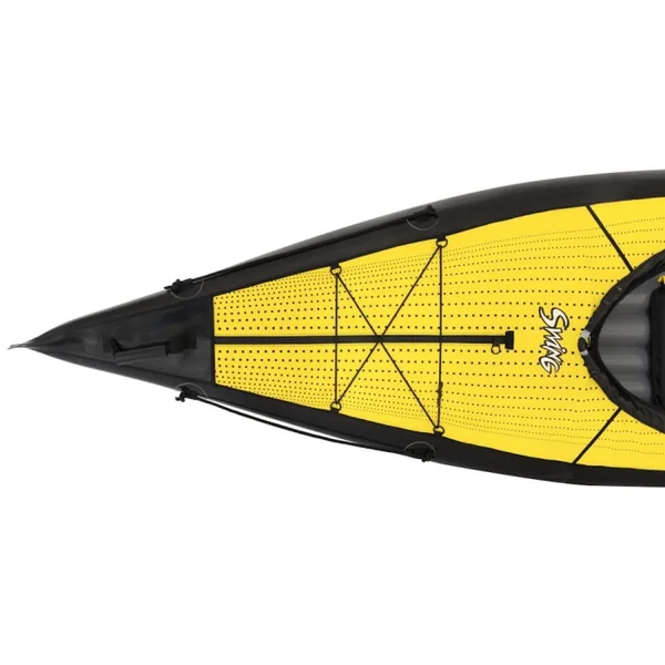 La nouvelle version 2021 du SWING 2 : Kayak monoplace ponté désormais réalisé en tissu « Nitrilon standard ». Le textile polyester de 1100 DTX est enduit d’élastomère à l’extérieur comme à l’intérieur des bateaux, avec un poids de tissu total de 1000 gr./m2, pour une légèreté et un encombrement inégalés dans le monde du gonflable ! Le Swing dispose maintenant du modèle de pont de la gamme RUSH, ce qui permettra d’y installer des jupes néoprène afin d’avoir un bateau totalement étanche.