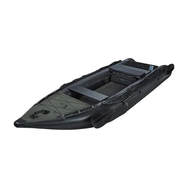 Fabriqué en PVC tissé effet carbone de 0,90 mm d’épaisseur, le E-Rider 330 allie solidité et durabilité. Son plancher drop-stitch gonflable bénéficie d’une couche antidérapante et protectrice, garantissant un confort optimal et une excellente accroche en action de pêche. Sous la coque, des patins de glisse extra-longs améliorent la stabilité directionnelle et la fluidité de navigation.
