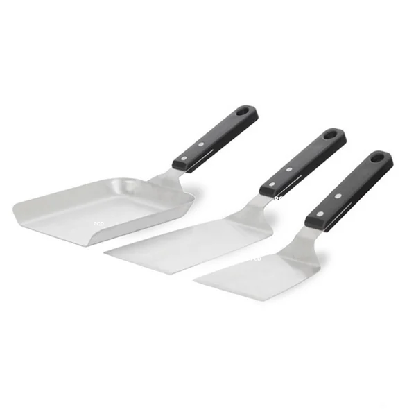 Découvrez ce kit de trois spatules en inox composé d’une spatule classique, d’une spatule longue et d’une spatule à rebords.