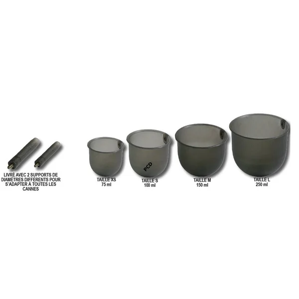 Ce kit est composé de 4 tailles différentes de coupelles (Taille XS/75ml, Taille S/100ml, Taille M/150ml, Taille L/250ml), ainsi que de deux systèmes de fixation.