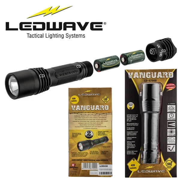LAMPE LEDWAVE VANGUARD 420 LUMENS :Caractéristiques :-Lampe Ledwave compact et résistante aux chocs.-Ledwave Lampe Vanguard 220 lumens 14 cm Anti choc/Anti Humidité.-Robuste.-Très bon rapport qualité/prix.-Puissante et compacte.-La Lampe Tactique Vanguard est destinée aux militaires, forces de police, agent de sécurité, randonneurs, chasseurs, etc-Le poids plume parmi les lampes de chasse modernes.-En utilisant les derniers matériaux de polymère durables et faciles à nettoyer.-Livrée avec 2 piles CR123A.-Ampoule LED.-Durée de fonctionnement : 150minutes.-Lumière jusquà 272m.-Rendement lumineux : 220 lumens.-Poids: 308g.-Dimensions : 14cm.