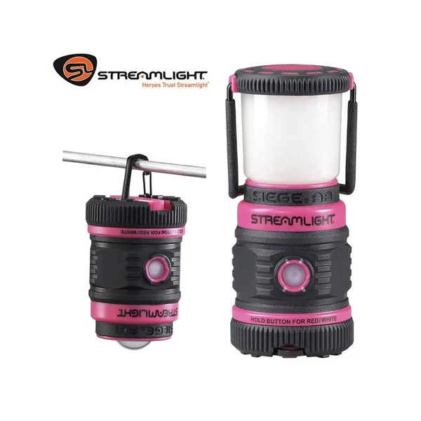 LAMPE STREAMLIGHT SIEGE AA AVEC BASE MAGNETIQUE ROSE : Caractéristiques :-Streamlight Siege AA avec base magnétique – Rose-Lanterne robuste et compacte idéale pour les situations où il vous faut beaucoup de lumière sans prendre de place.-La lanterne Siege AA fonctionne avec des piles alcalines AA et fournit un éclairage doux et homogène sur 360° couvrant ainsi une grande surface.-Plusieurs modes :Led C4 blanche :- Fort : 200 lumens; pour 7 heures dautonomie.- Moyen : pour un éclairage lumineux qui dure plus longtemps : 100 lumens; 15h30 dautonomie.- Faible : pour une autonomie prolongée lorsque l’on a besoin de moins de lumière : 50 lumens; 37 heures dautonomie.Led rouge : (2 LED rouges, préserve la vision nocturne).- Fort : 0.7 lumens; pour 8 jours dautonomie.- Mode Flash SOS : pour signaler une urgence : 0.7 lumens; pour 12 jours dautonomie.-Fonctionne avec 3 piles alcalines « AA ».-Le bouton enfoncé empêche la mise en action accidentelle.-Niveau de la batterie indiqué sur le bouton (changement de couleur).-Couvercle des piles avec touches pour faciliter le remplacement des piles dans l’obscurité.-La Siege® AA se tient droit ou saccroche avec les clips incorporés pour l’usage mains-libres.-Anneau dattache sur le socle de la lanterne.-La poignée ergonomique comporte un crochet intégré. Elle peut-être verrouillée en position droite ou repliée.-Possibilité de retirer la lentille diffusante pour un éclairage direct.-3 aimants en acier sous la surface pour lusage main libre.-Construction en Polymère résistant avec une base en caoutchouc pour garder une stabilité sur les surfaces glissantes.-Compartiment étanche dans la base.-Etanchéité IPX7 à 1m dimmersion.-La lanterne flotte ;-2m de résistance à l’impact.-Dimension et poids : 13.82 cm – 257.98g avec batteries.