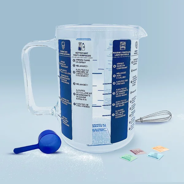 Le produit multifonctions par excellence. Bien plus qu’un simple verre doseur, il vous indique comment préparer 8 recettes d’entretien express et faciles pour toute la maison :