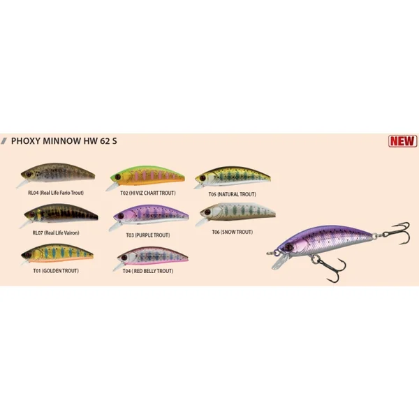 Leurre Sakura Phoxy Minnow HW Coulant 62 mm 6,5 gr La gamme de Phoxy Minnow HW 40S – 50S – 62S est maintenant bien étoffée avec 3 tailles complémentaires.
