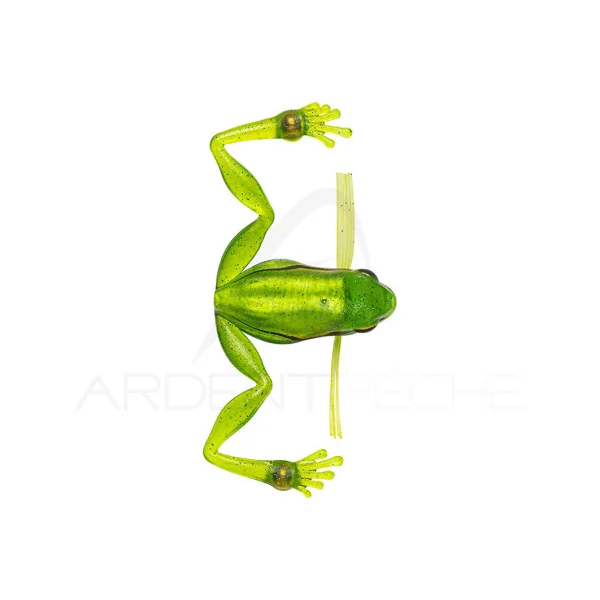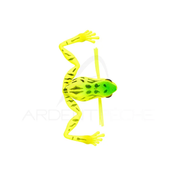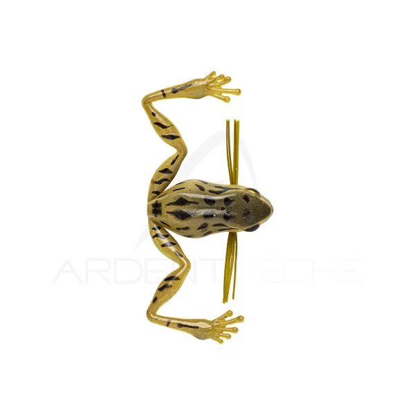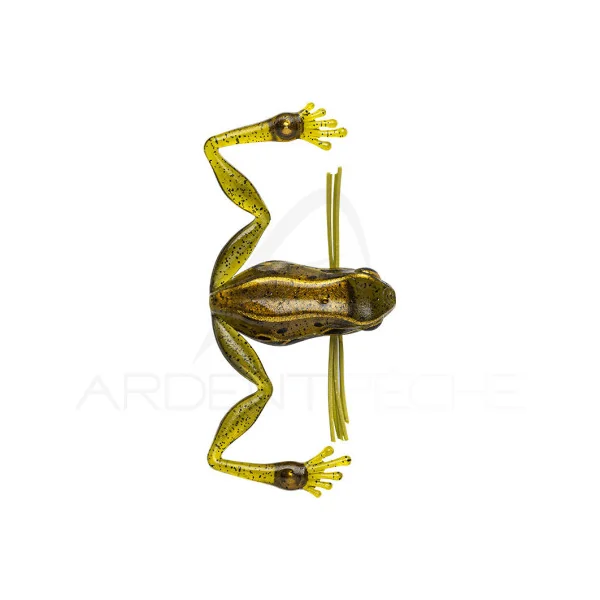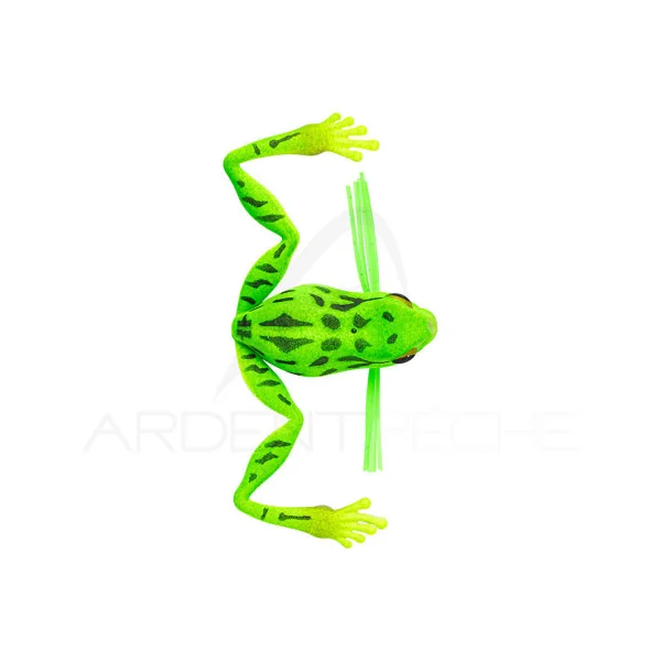 Une petite grenouille avec un corps flottant mais avec un petit lest dans chaque bout des pattes pour qu’elle se tienne le plus naturellement possible dans l’eau lorsqu’elle est à l’arret. Ces petites billes en tungsten ont aussi l’avantage d’amplifier les plus petits mouvements lorsque vous voudrez faire trembler la frog sur place. Un emplacement est prévu sous la bouche pour venir piquer l’hameçon simple fourni, ainsi elle passe bien dans les obstacles et reste très efficace au ferrage.