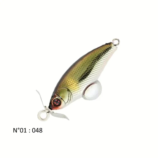 Le Phoxy Spybait, de marque Sakura, est un minnow compact doté d’une hélice métallique frontale.