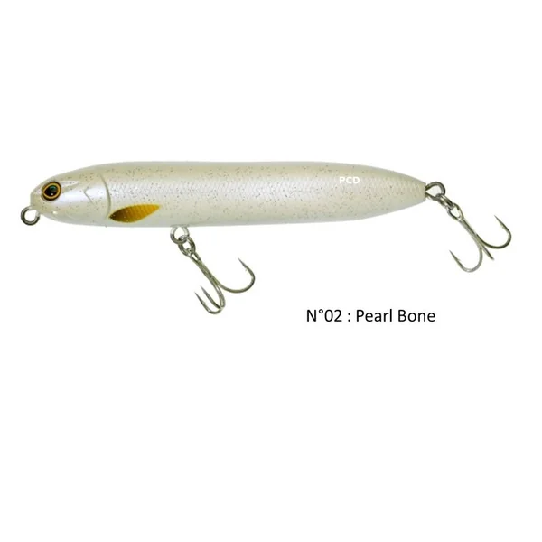 Ce leurre de surface de type ‘stickbait’ dont la puissance sonore insoupçonnable est obtenue grâce à deux billes métalliques circulant librement dans une chambre spécialement designée comme un prisme (multiples rainures) afin de faire grincer les billes et ainsi créer une sonorité grave unique mais également amènera un stimulus visuel par réflexion de la lumière à travers cette cavité.