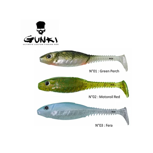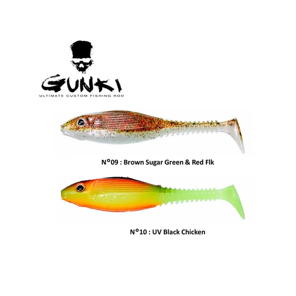 Shad, de marque Gunki, de forte corpulence a qui nous avons associé une tête massive, dont la plus large surface améliore la tenue de la tête plombée.