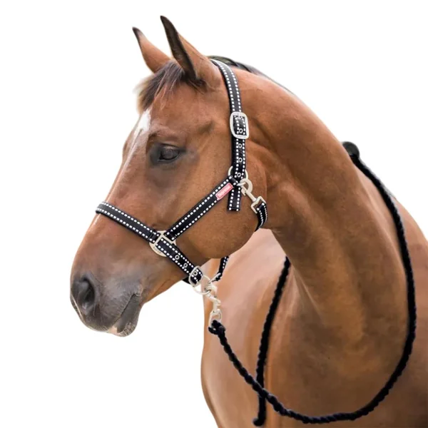 Le kit Cooper se compose d’un licol en polyester noir à motif pointillé et d’une longe en coton tressé assortie, formant ensemble un ensemble élégant, fonctionnel et résistant Têtière & muserolle ajustables : permet un ajustement précis à la tête Longe de 2 mètres : en 100 % coton, finition tressée avec mousqueton simple, idéal pour le travail en main ou la présentation de box Polyvalence quotidienne : adapté pour le pansage, les soins, le transport, la mise au pré, etc. Confort pour le cheval : matériaux légers, réglages personnalisables pour un bon maintien et éviter les frottements. Esthétique soignée : motif tissu discret et sobre, parfait pour un usage quotidien ou occasionnel Durabilité : polyester résistant et longe en coton robuste ; nettoyage facilité (rinçage à l’eau froide, séchage à l’air) .