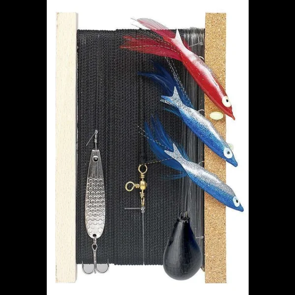 Montée sur un plioir en bois avec bande liège pour fixer les hameçons (La ligne est attachée au plioir).