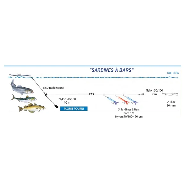 Longueur totale : +/- 60 m. Composition +/- 50 m de tresse, 1 pater black nickel, 1 plomb de 200 g relié par un cassant d’1 m en 80/100, , 10 m de Nylon en 70/100 après le pater, un émerillon anti-vrillage reliant le bas de ligne de 90 cm en 50/100 composé de 5 « sardines à bars » pailletées avec hameçon N° 1/0, terminal de 2 m de Nylon en 50/100 avec une cuiller a maquereaux (hameçon triple N°1/0 ).