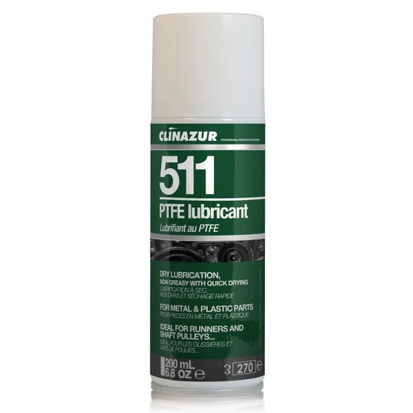 Lubrifiant au téflon Clin’Azur 511 – 200ml Formulation lubrifiante à sec extrêmement fine ( PolyTétraFluorEthylène et solvant volatile / particules de PFTE de 5 microns ) pour tous les matériaux : bois, cuir, métal, plastique, caoutchouc, etc. Utilisé pour les glissières, tiroirs, axes de poulies, chariots de barre d’écoute, panneaux de ponts, ridoirs, glissières de vêtements et de sacs, coulisseaux de grand voile, etc. Laisse les supports secs, propres et non huileux. Exceptionnelle tenue en température : de – 120° à + 260°.