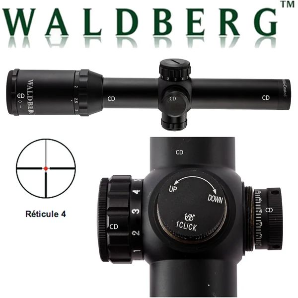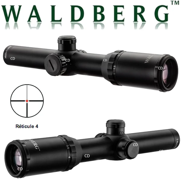 LUNETTE DE BATTUE WALDBERG 1-4X24 IR :Caractéristiques :-Lunette de battue, de marque Waldberg, 1-4×24 IR : un excellent rapport qualité prix et une finition de qualité pour une lunette de battue efficace et robuste.-Réticule 7 avec point lumineux.-11 niveaux d’intensité.*Caractéristiques Techniques :-Diamètre de lobjectif : 24mm.-Diamètre du corps : 30mm.-Grossissement : De 1,5 à 4 fois.-Longueur : 275mm.-Champ de vision : 34,4 mètres à 100m.-Indice crépusculaire : 9,8.-Pile CR2032 fournie.-Poids : 450g.-Coloris : Noir.*Prix de vente conseillé 2017 : 380€.*Nous consulter pour le montage.
