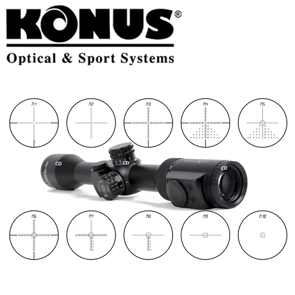 Nouvelle lunette Konus, pourvue de 10 réticules interchangeables !Idéale pour toutes les utilisations !!!Une exclusivité mondiale de Konus et le résultat d’une décennie de projet d’ingénierie électronique, ce modèle unique en son genre tire parti d’une technologie ACL brevetée qui vous permettra de parcourir 10 réticules interchangeables pour le tir à longue portée, l’utilisation intermédiaire, la tactique et la chasse.-Il s’agit donc de la technologie la plus avancée et la plus polyvalente du marché, un véritable bond en avant qui fait enfin entrer l’industrie optique dans le 21ème siècle.*Caractéristiques Techniques :-Couleur : Noir.-Grossissement : De 4 à 16 fois.-Diamètre objectif : 44mm.-Diamètre corps : 30mm.-Réticule : 10 interchangeables.-Soulagement des yeux : 78 à 85mm.-Quitter la pupille : 2,7 – 11mm.-Valeur du clic de réglage : 0,1 mil Rad.-Plage de réglage : 178mm à 100m.-Champ visuel : 6,8 m à 100m.-Couches optique : entièrement multicouche.-Etanche : oui.-Antichocs : Oui.-Antibrouillard : Oui.-Longueur : 333mm.-Poids : 663g.-Matériaux : Aluminium.-Autres caractéristiques : Tourelles tactiques de verrouillables, technologie ACL.