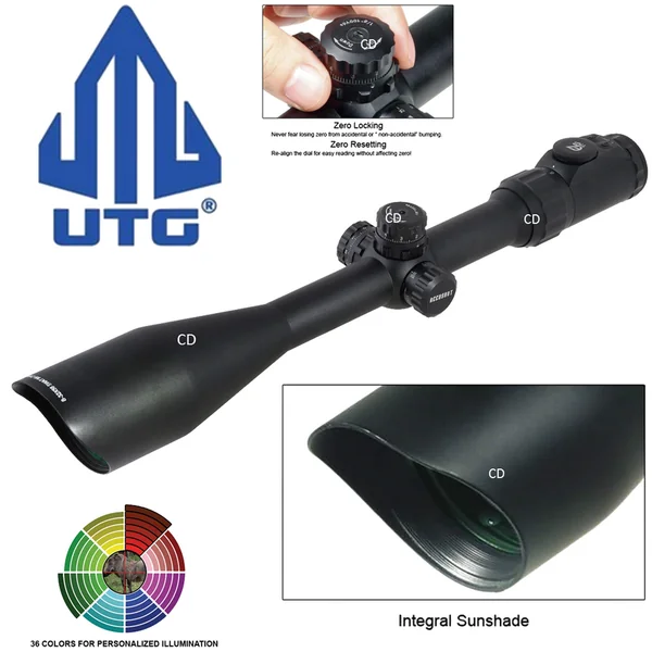 LUNETTE TACTIQUE UTG 4-16X56 Mildot illuminée :Caractéristiques :-Lunette de tir Sniper à 3 tourelles.-Tourelles de réglage en élévation et en dérive réglables sans outils.-Verrouillage rapide par couronne de blocage à la base de chaque tourelle.-Remise à zéro avec clef 6 pans. Réglage : 1 clic = 1/8″ à 100 yards soit 1/8 ème de MOA.-Tourelle de gauche : réglage de parallaxe.-Bague de zoom largement dimensionnée-Réticule Mildot illuminé Rouge/Vert et 36 couleurs.-Fonctionne avec 1 pile CR2032 fournie.-Livrée avec montage Picatinny (2 colliers hauts), 2 bonnettes rabattables, 2 clefs 6 pans, 2 piles CR2032 et 1 chiffon microfibre.*Caractéristiques Techniques :-Réticule Milldot illuminée.-Grossissement : De 4 à 16 fois.-Longueur 418mm.-Diamètre de l’objectif : 56mm.-Diamètre pupillaire : 14mm – 3.5mm.-Diamètre du corps : 30mm.*Prix de vente conseillé 2017 : 320€.*Pour les différents montages, nous consulter.