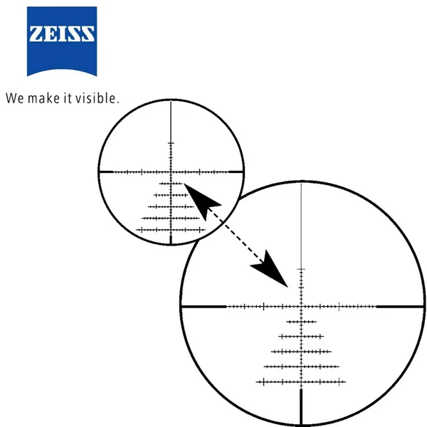 Le réticule balistique ZEISS ZBR est dans le second plan focal et dispose d’une couverture de 1 MOA (ZBR-1) entre les marques pointillées au grossissement de référence de la lunette de visée correspondante.