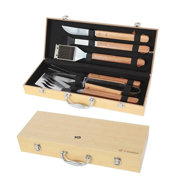 Découvrez ceci ensemble d’ustensiles en inox et en bambou Le Marquier et leur mallette, composé d’une spatule, d’une fourchette, d’une pince, d’un pinceau, d’un couteau et d’une brosse métallique.
